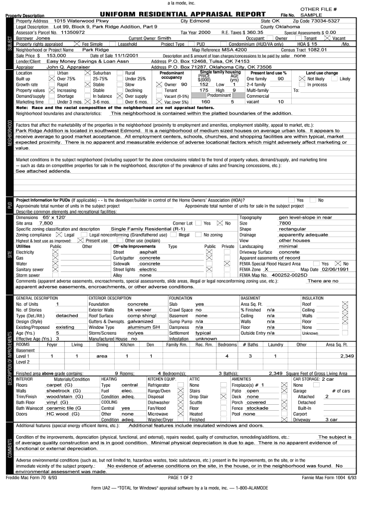 À la mode, inc. SUBJECT OTHER FILE # UNIFORM RESIDENTIAL APPRAISAL REPORT File No. SAMPLE Property Description Property Address 1015 Water wood Pkwy City Edmond State OK Zip Code 730345327 Legal