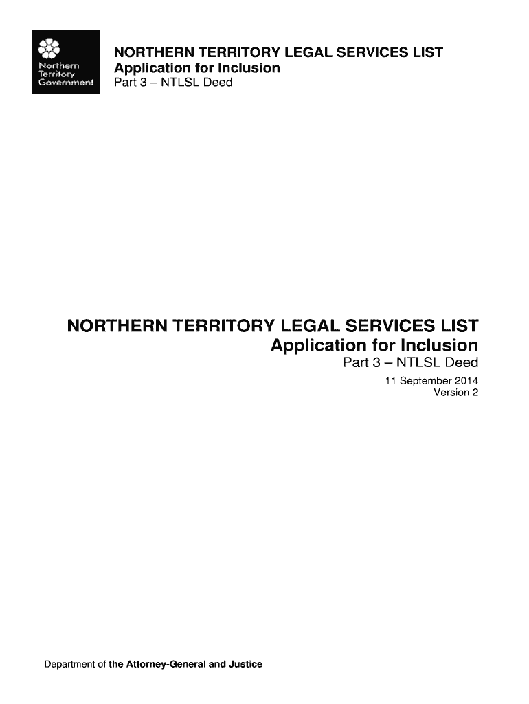 NORTHERN TERRITORY LEGAL SERVICES LIST Application for Inclusion Part 3 NT LSL Deed NORTHERN TERRITORY LEGAL SERVICES LIST Application for Inclusion Part 3 NT LSL Deed 11 September 2014 Version 2