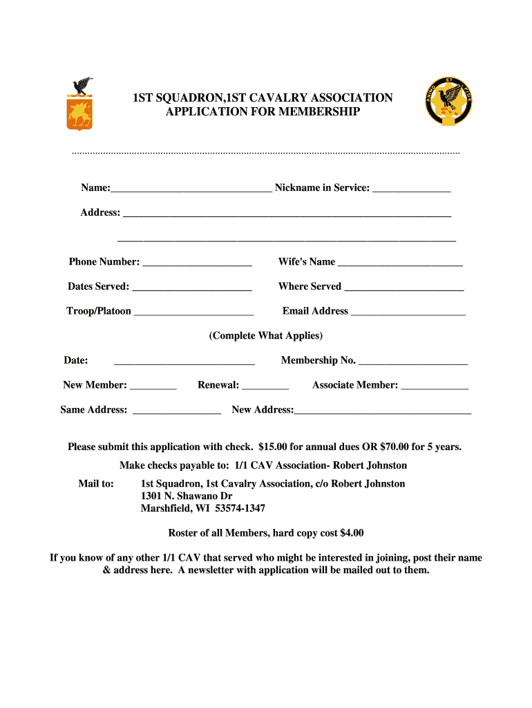To fill out the 1st Squadron 1st Cavalry Association, members must provide personal information, military service details, and any contributions or dues.