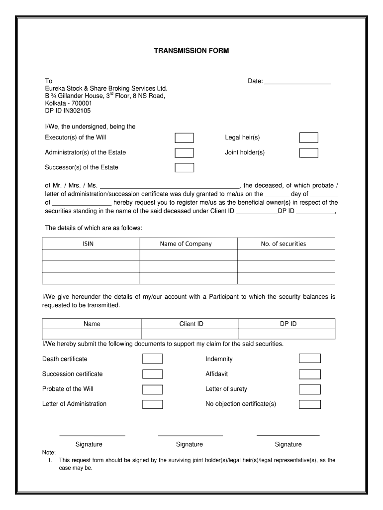 Get the free Transmission Form - Eureka Stock & Share Broking Services Limited