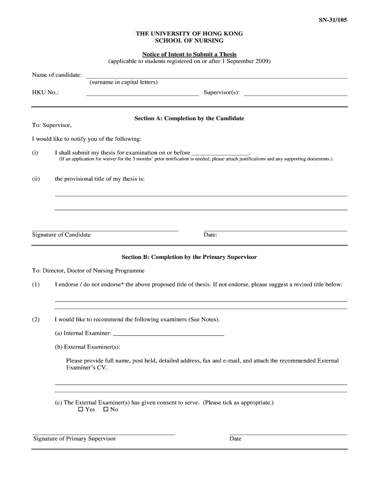 SN31/105 THE UNIVERSITY OF HONG KONG SCHOOL OF NURSING Notice of Intent to Submit a Thesis (applicable to students registered on or after 1 September 2009) Name of candidate: (surname in capital letters)