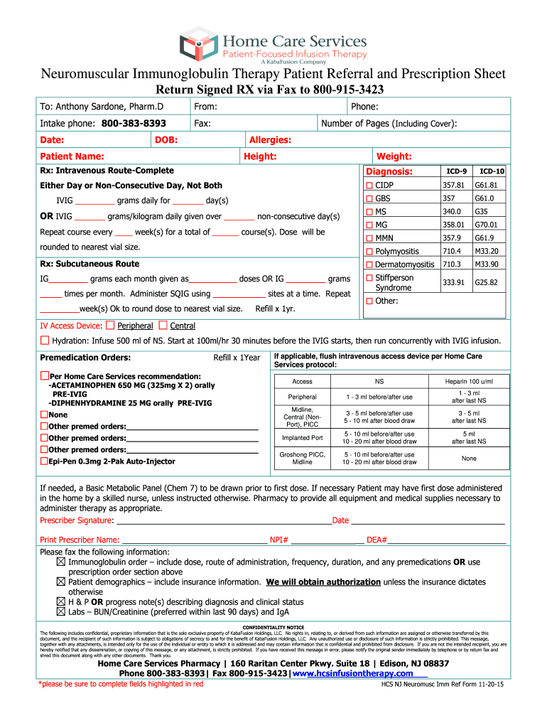 Neuromuscular Immunoglobulin Therapy Patient Referral and Prescription Sheet Return Signed RX via Fax to 8009153423 To: Anthony Sardine, Harm'd From: Intake phone: 8003838393 Fax: Date: Phone: Number