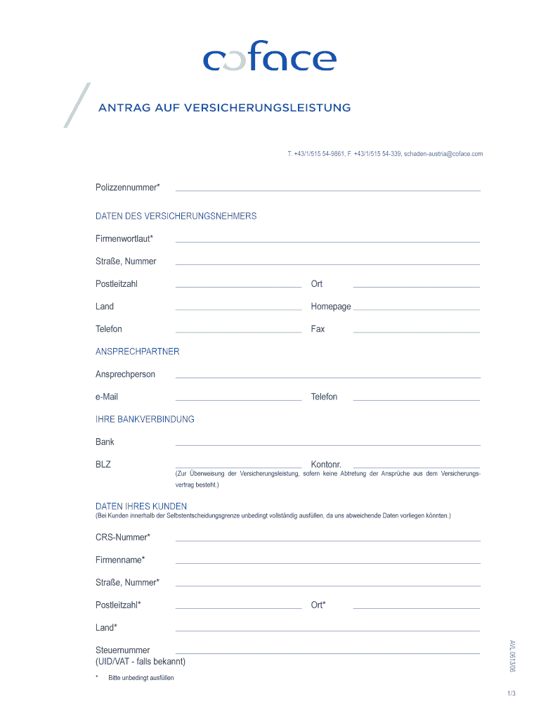 / ANT RAG AUF VERSICHERUNGSLEISTUNG T. +43/1/515 549861, F. +43/1/515 54339, schadenaustria coface.com Polizzennummer** DATE DES VERSICHERUNGSNEHMERS Firmenwortlaut* Straw, Number Postnatal ORT Land