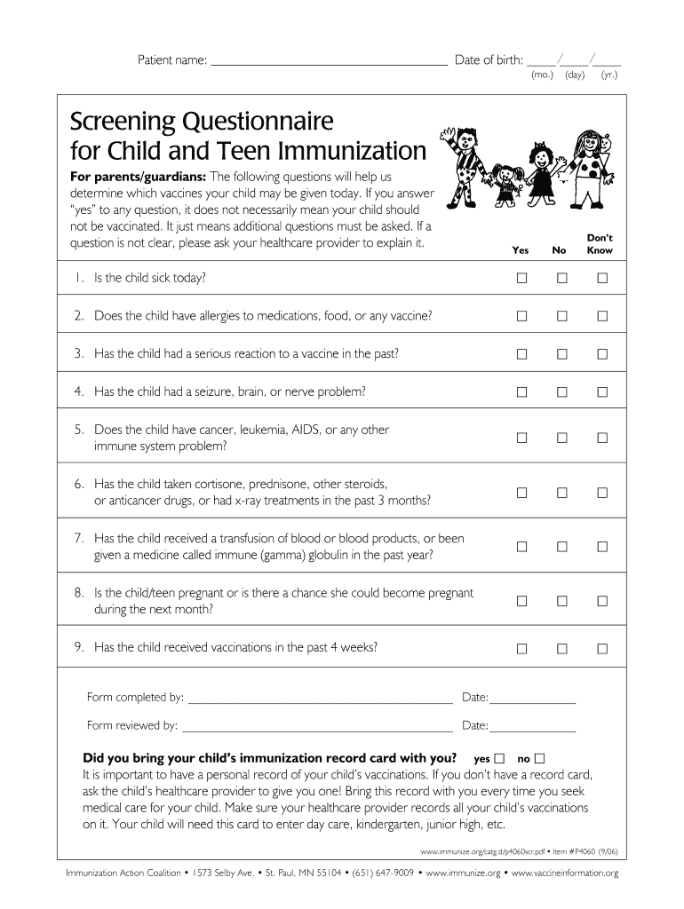 Patient name: Date of birth: (mo.) (yr.) (day) Screening Questionnaire for Child and Teen Immunization For parents/guardians: The following questions will help us determine which vaccines your child