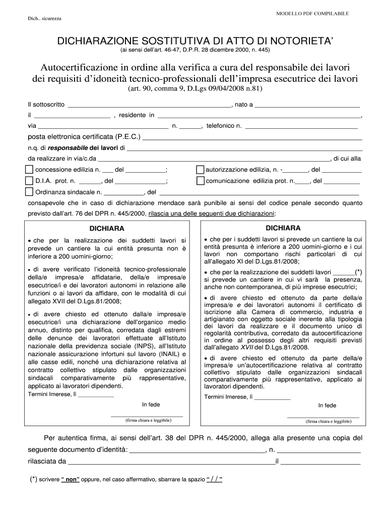 MODEL LO PDF COMPILABLE Rich. Sicurezza DICHIARAZIONE CONSTITUTIVE DI AUTO DI NOTORIETY (AI sense dell art. 4647, D.P.R. 28 December 2000, n. 445) Autocertificazione in or dine alley verified a Cuba