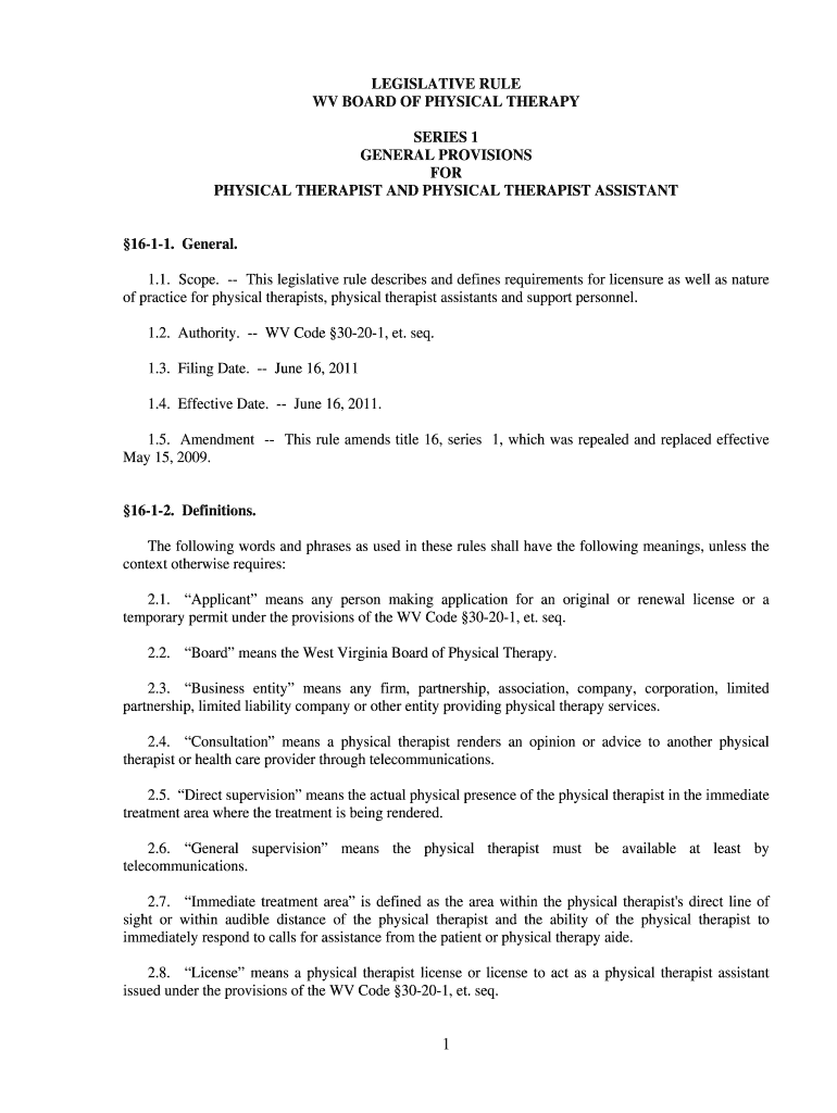 LEGISLATIVE RULE WV BOARD OF PHYSICAL THERAPY SERIES 1 GENERAL PROVISIONS FOR PHYSICAL THERAPIST AND PHYSICAL THERAPIST ASSISTANT1611. General. 1.1. Scope. This legislative rule describes and defines