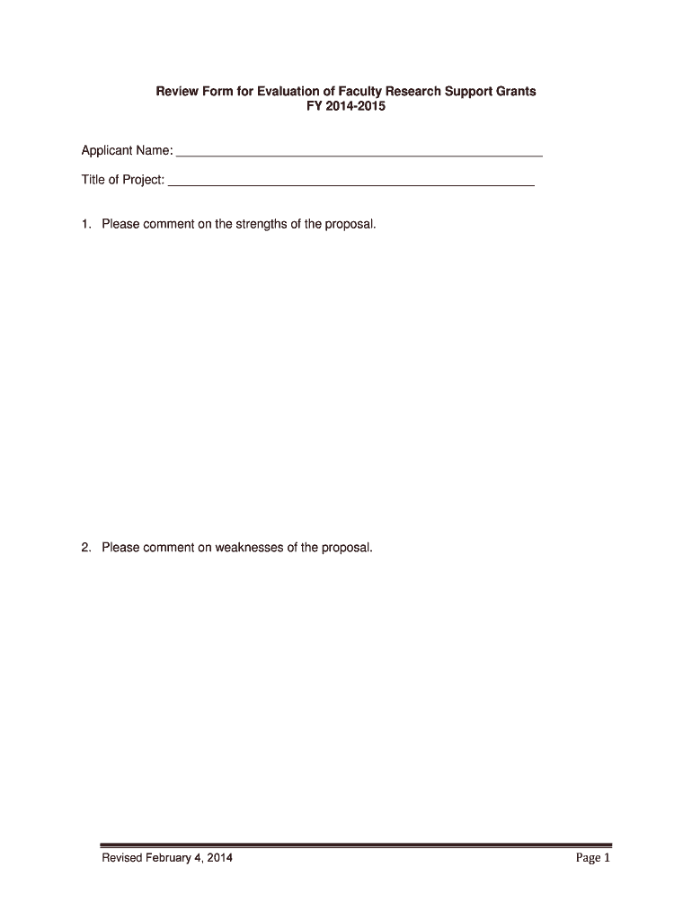 Review Form for Evaluation of Faculty Research Support Grants FY 20142015 Applicant Name: Title of Project: 1. Please comment on the strengths of the proposal. 2. Please comment on weaknesses of the