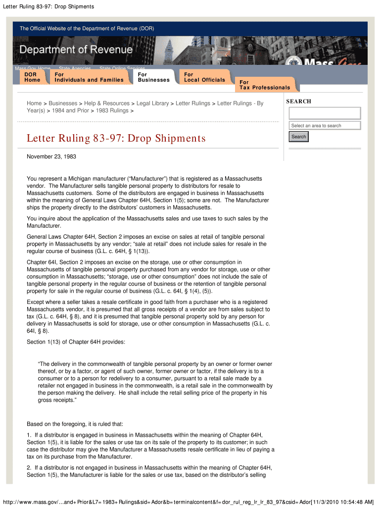 Letter Ruling 83-97: Drop Shipments The Official Website of the Department of Revenue (FOR) Mass. Gov Home FOR Home State Agencies State Online Services For Individuals and Families For Businesses