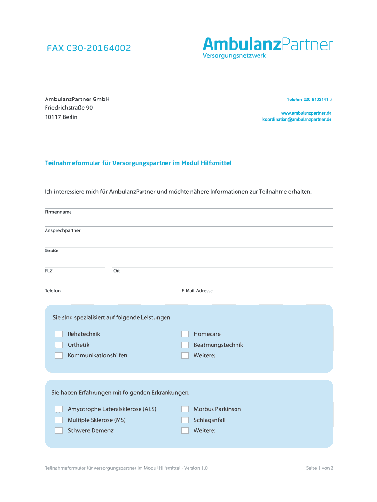 FAX 03020164002 Versorgungsnetzwerk AmbulanzPartner GmbH Friedrichstrae 90 Telephone 03081031410 www.ambulanzpartner.de coordination ambulanzpartner.DE 10117 Berlin Teilnahmeformular for Versorgungspartner