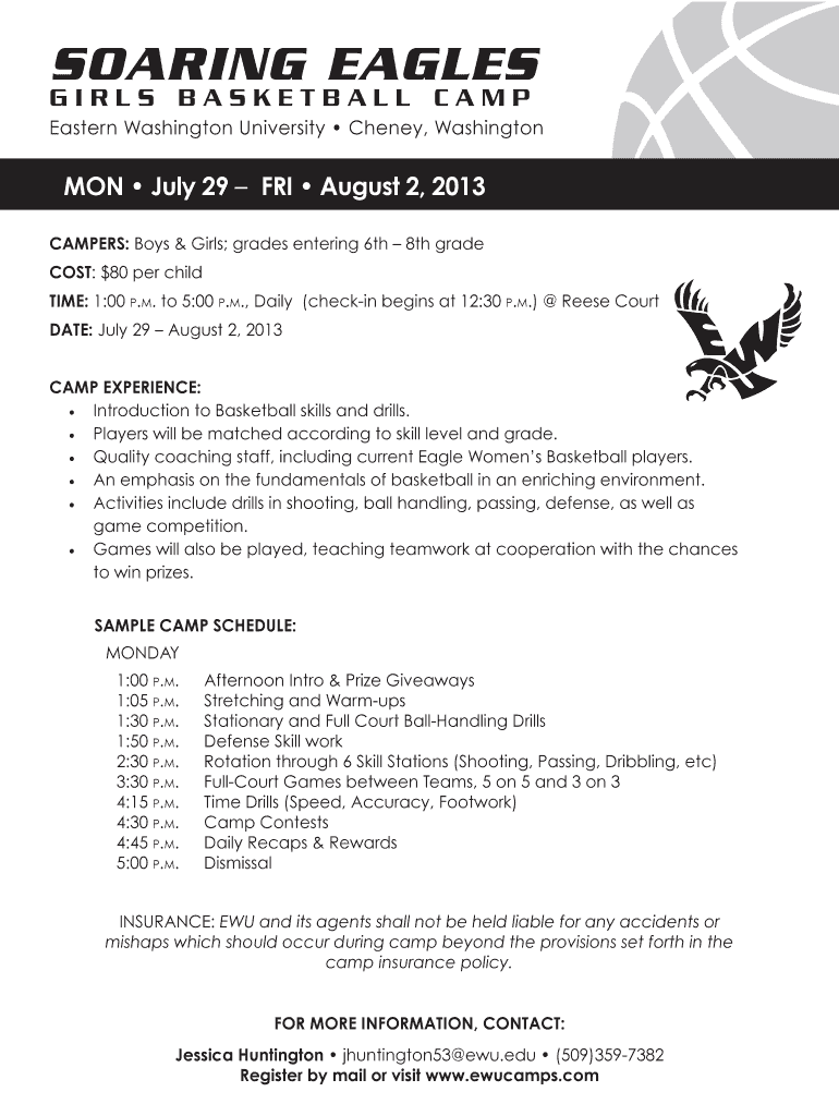 SOARING EAGLES GIRLS BASKETBALL CAMP Eastern Washington University Cheney, Washington MON July 29 FRI August 2, 2013, CAMPERS: Boys & Girls; grades entering 6th 8th grade COST: $80 per child TIME:
