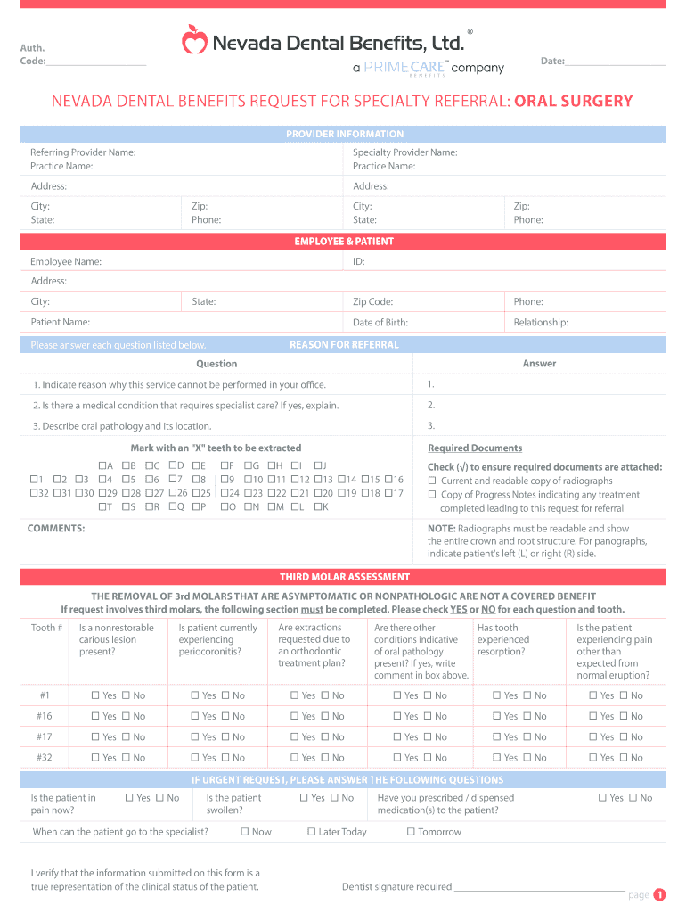 Auth. Code: Date: B E N E F I T S NEVADA DENTAL BENEFITS REQUEST FOR SPECIALTY REFERRAL: ORAL SURGERY PROVIDER INFORMATION Referring Provider Name: Practice Name: Specialty Provider Name: Practice
