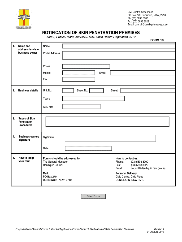 Get the free Notification of Skin Penetration Premises bformb - Deniliquin Council - deniliquin n...
