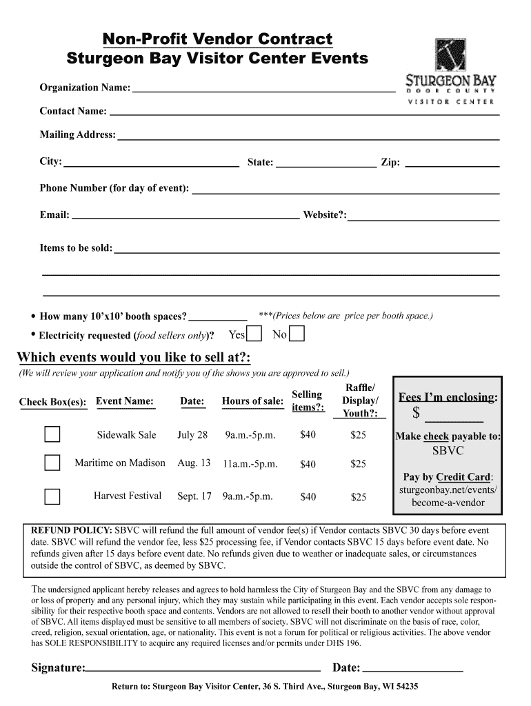 Nonprofit Vendor Contract Sturgeon Bay Visitor Center Events Organization Name: Contact Name: Mailing Address: City: State: Zip: Phone Number (for day of event): Email: Website?: Items to be sold: