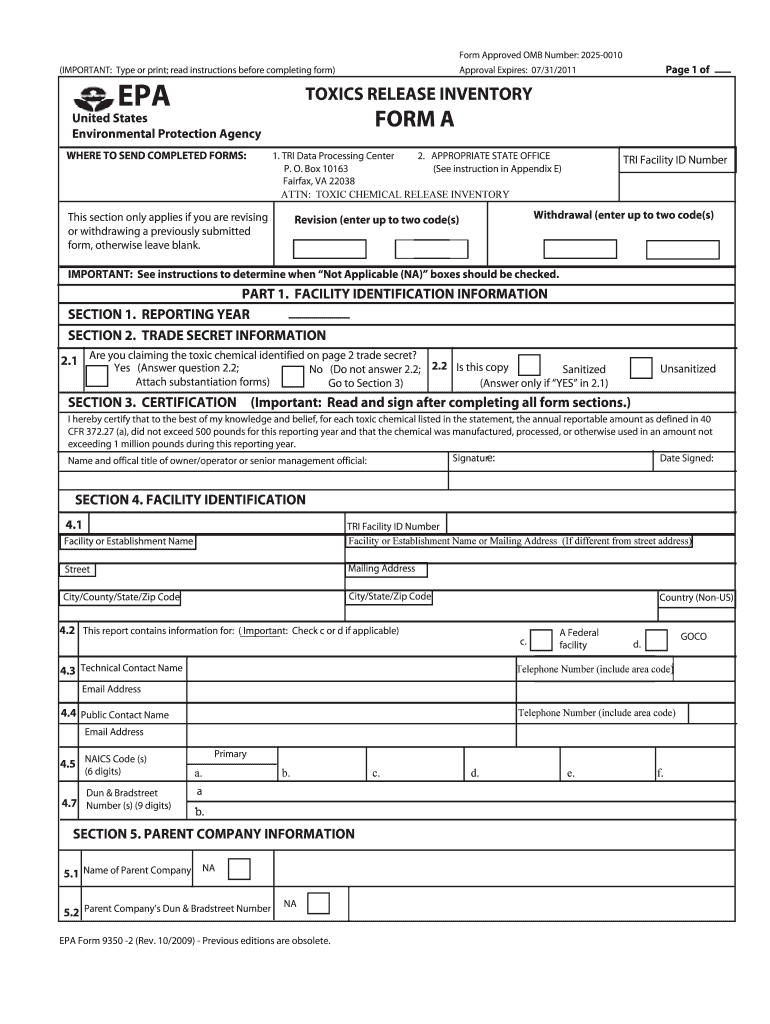 Get the free US EPA Toxic Chemical Release Inventory Form A