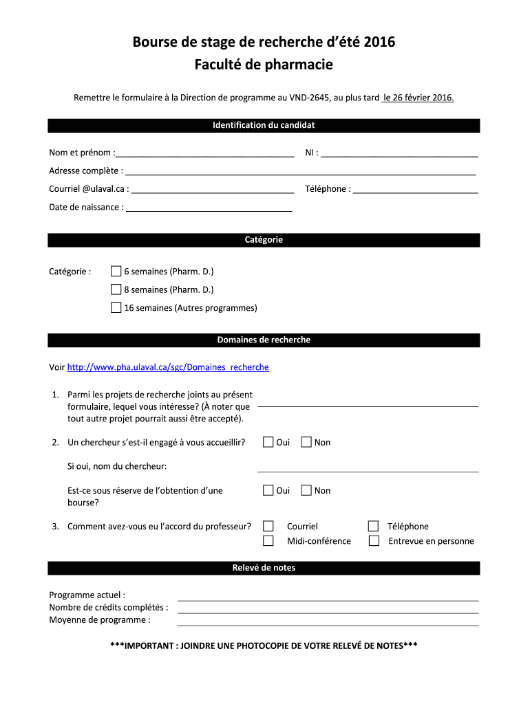 Course DE stage DE recherché DT 2016 Faculty DE pharmacies Resettle LE formula ire la Direction DE program AU VND2645, Au plus tard LE 26 frier 2016. Identification Du candidate No met prom : NI