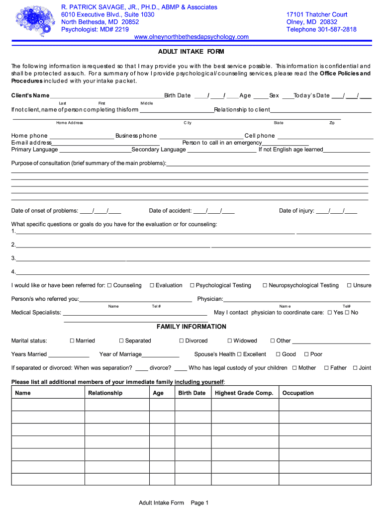 R. PATRICK SAVAGE, JR., Ph.D., AMP & Associates 6010 Executive Blvd., Suite 1030 North Bethesda, MD 20852 Psychologist: MD# 2219 www.olneynorthbethesdapsychology.com 17101 Thatcher Court Olney, MD