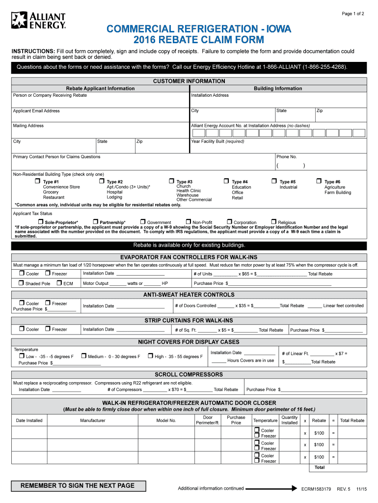 Page 1 of 2 COMMERCIAL REFRIGERATION IOWA 2016 REBATE CLAIM FORM PRINT FORM SAVE FORM RESET FORM INSTRUCTIONS: Fill out form completely, sign and include copy of receipts. Failure to complete the