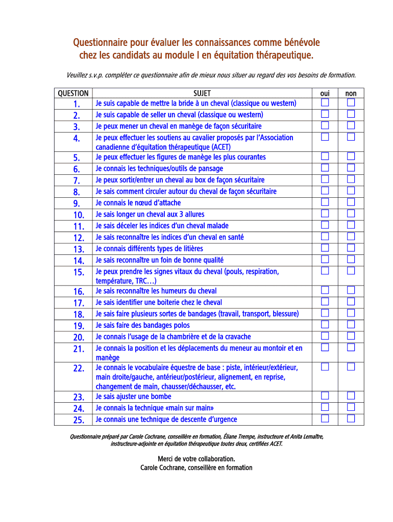 Obtenir le gratuit Questionnaire pour valuer les connaissances comme bnvole chez les candidats au...