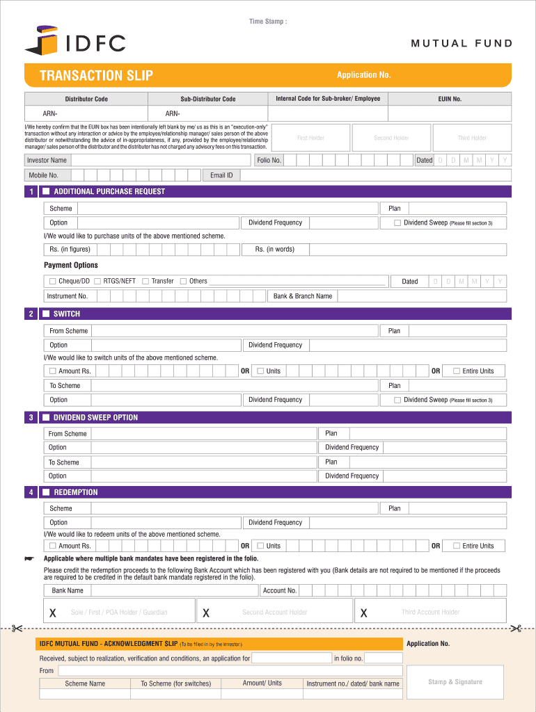 Time Stamp : TRANSACTION SLIP Application No. Distributor Code Internal Code for Subbroker/ Employee Distributor Code ARN RUIN No. ARN I/We hereby confirm that the RUIN box has been intentionally