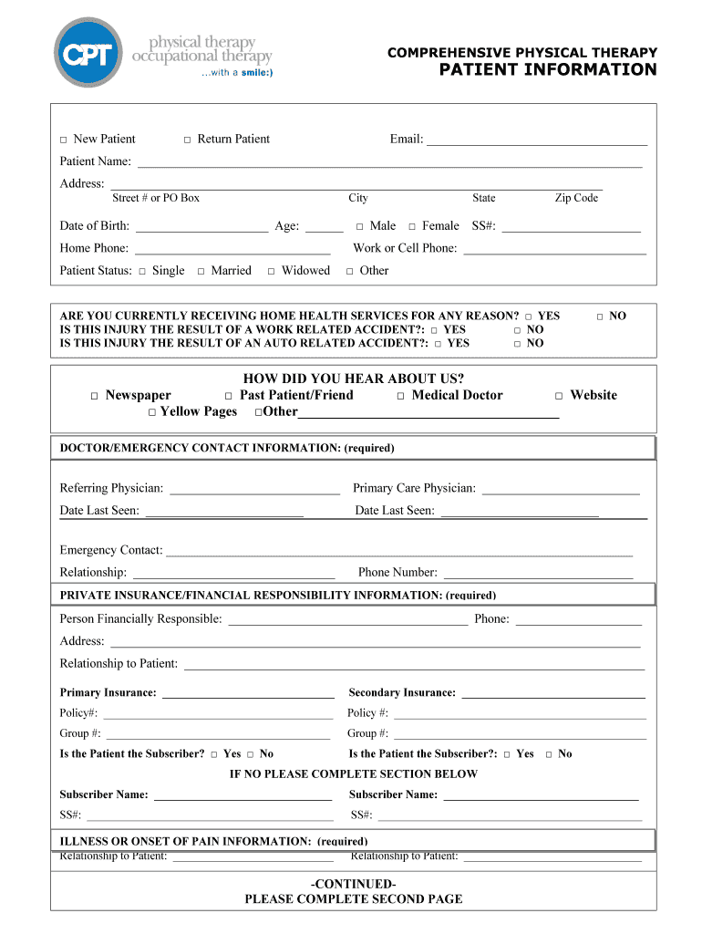 COMPREHENSIVE PHYSICAL THERAPY PATIENT INFORMATION New Patient Return Patient Email: Patient Name: Address: Street # or PO Box City Date of Birth: Age: Male Female Home Phone: Patient Status: Single