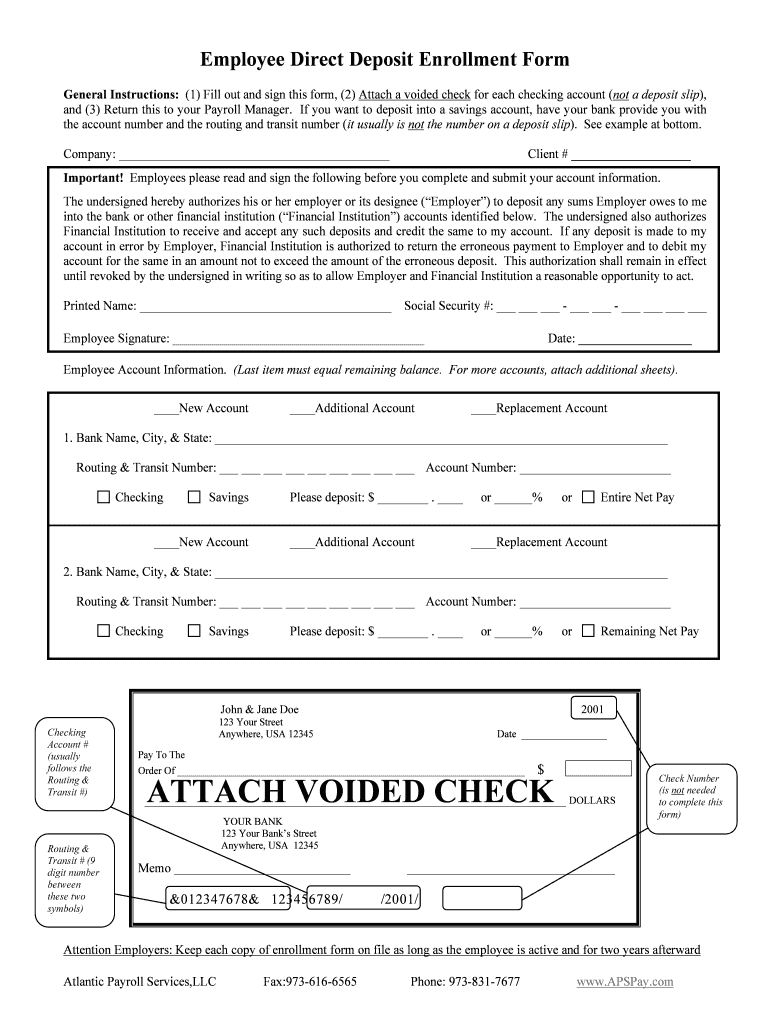 Employee Direct Deposit Enrollment Form General Instructions: (1) Fill out and sign this form, (2) Attach a voided check for each checking account (not a deposit slip), and (3) Return this to your