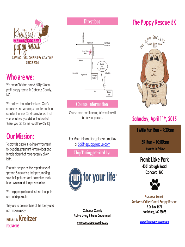 Directions The Puppy Rescue 5K SAVING LIVES, ONE PUPPY AT A TIME SINCE 2004 Who are we: We are a Christian based, 501(c)3 nonprofit puppy rescue in Cabarets County, NC. We believe that all animals