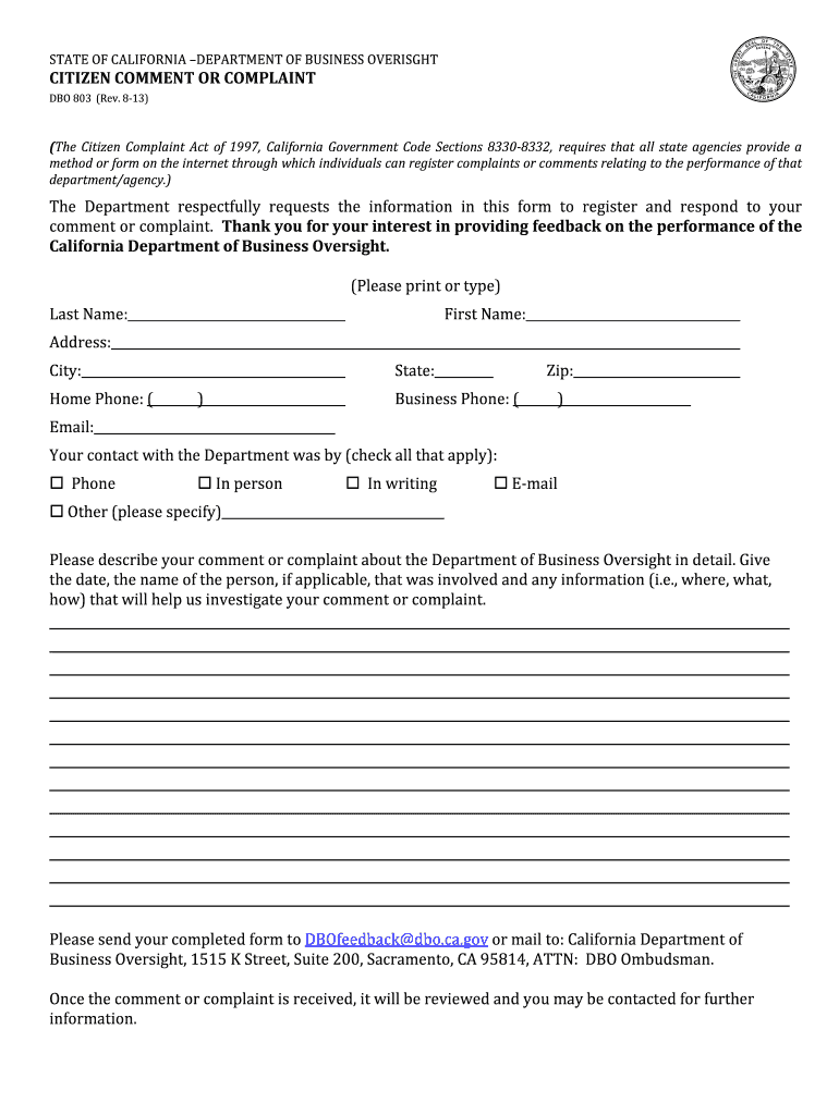 The California Citizen Comment or Complaint Form, also known as the DBO 803 form, serves as a vital feedback mechanism for the California Department of Business Oversight. This form allows residents to submit their comments or complaints regarding the department's performance.