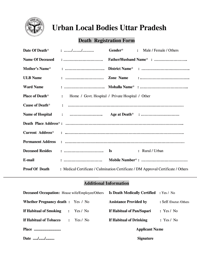 Date Of Death*: /./Gender×Name Of Deceased:. Father/Husband Name* :. Mothers Name*:. District Name*: .ULB Name: : ... Ward Name:. Morally