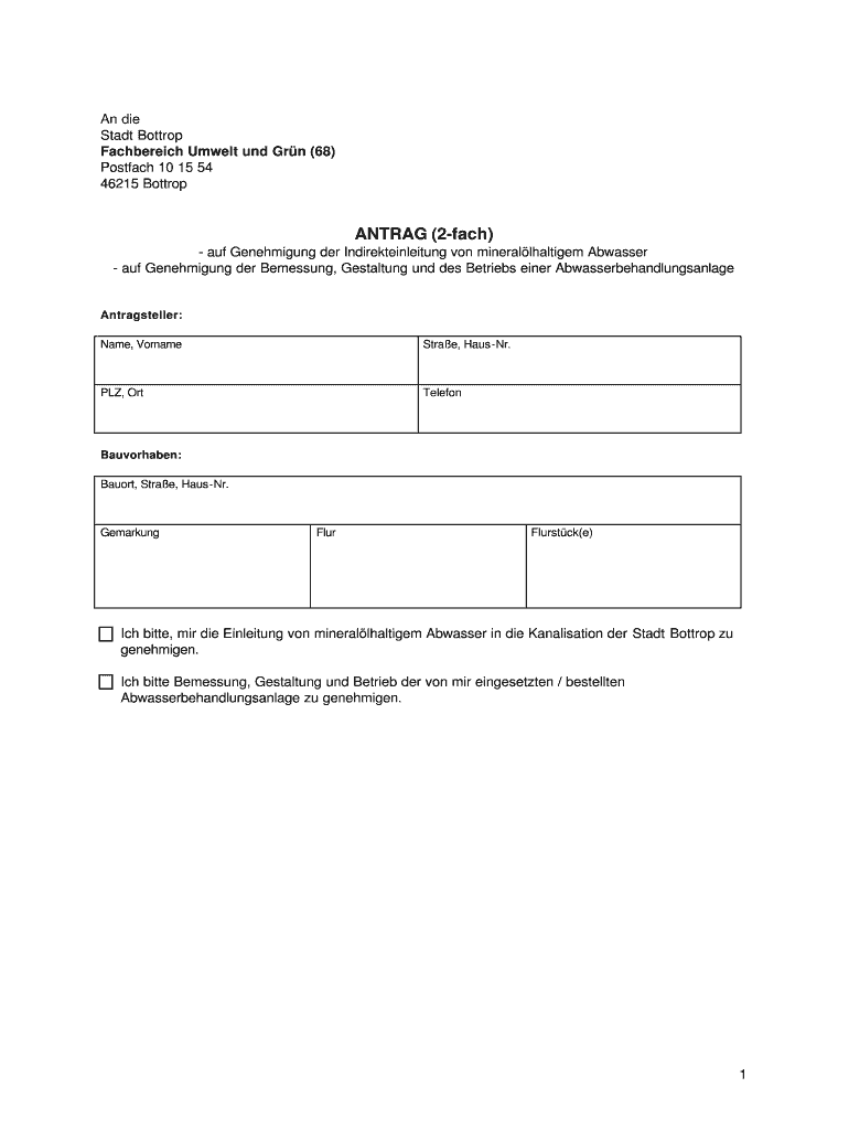 Her Ant rag Kane am Bildschirm ausgefllt warden. A die Start Bottrop Fachbereich Umwelt UND GRN (68) Postal 10 15 54 46215 Bottrop ANT RAG (2fach) AUF Genehmigung her Indirekteinleitung on minerallhaltigem