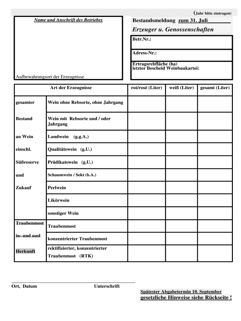 (Jar bitter antigen) Name UND Antichrist DES Retrieves Bestandsmeldung sum 31. July Kruger u. Genossenschaften Bear. NR.: Dresser.: Ertragsrebflche (ha) letter Beached Weinbaukartei: Aufbewahrungsort