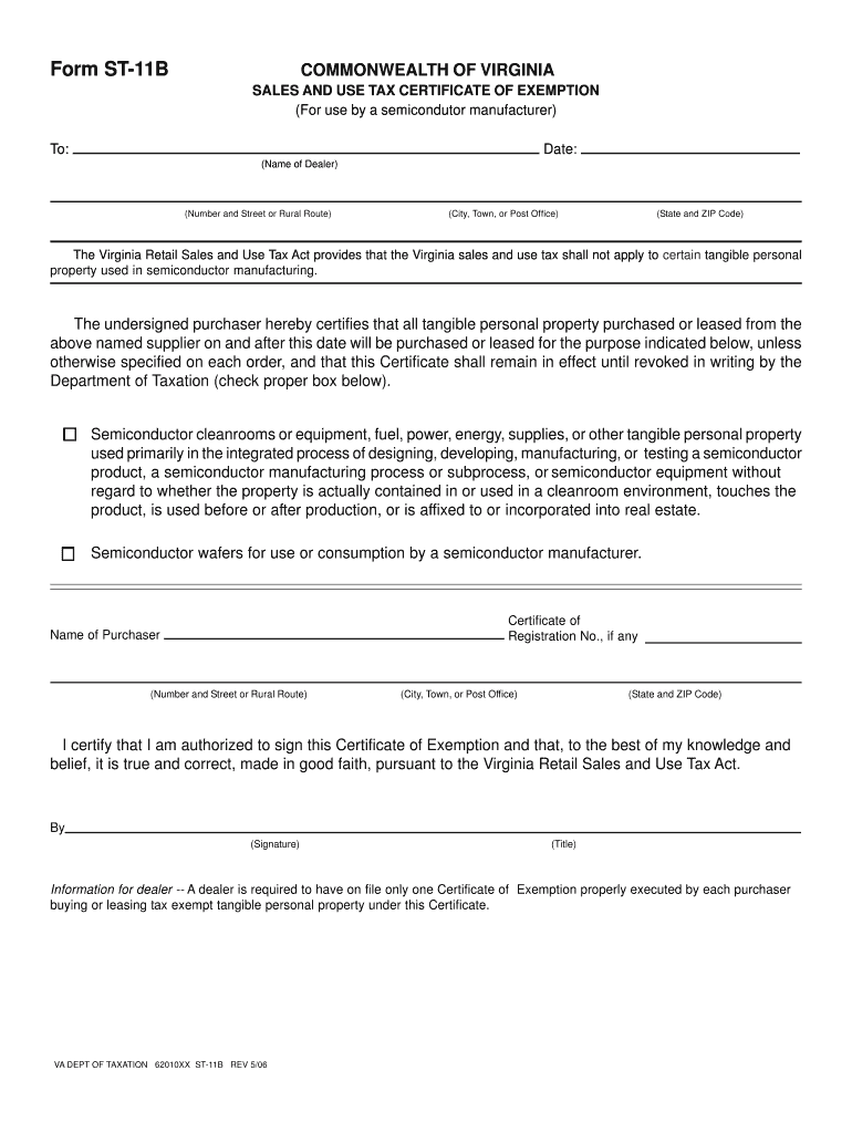 Form ST11B COMMONWEALTH OF VIRGINIA SALES AND USE TAX CERTIFICATE OF EXEMPTION (For use by a semiconductor manufacturer) To: Date: (Name of Dealer) (Number and Street or Rural Route) (City, Town,