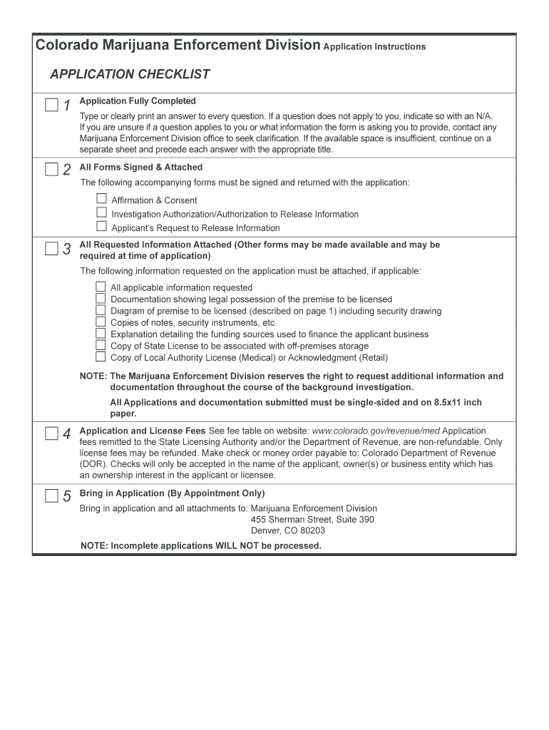 Marijuana Premises Storage Application Marijuana Enforcement Division DR 8518 (04/14/16) Colorado Marijuana Enforcement Division Application Instructions APPLICATION CHECKLIST 1 Application Fully