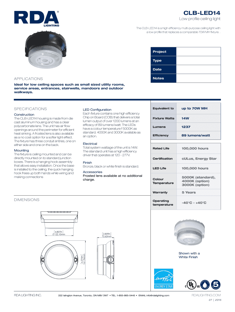 CLBLED14 Low profile ceiling light The CLBLED14 is a high efficiency multipurpose ceiling light with a low profile that replaces a comparable 70W MH fixture. . Project Type Date Notes APPLICATION