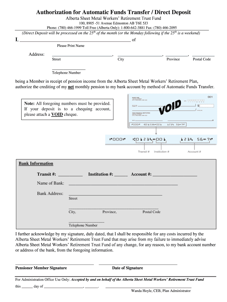 Authorization for Automatic Funds Transfer / Direct Deposit Alberta Sheet Metal Workers Retirement Trust Fund 100, 8905 51 Avenue Edmonton AB T6E 5J3 Phone: (780) 4661999 Toll Free (Alberta Only):
