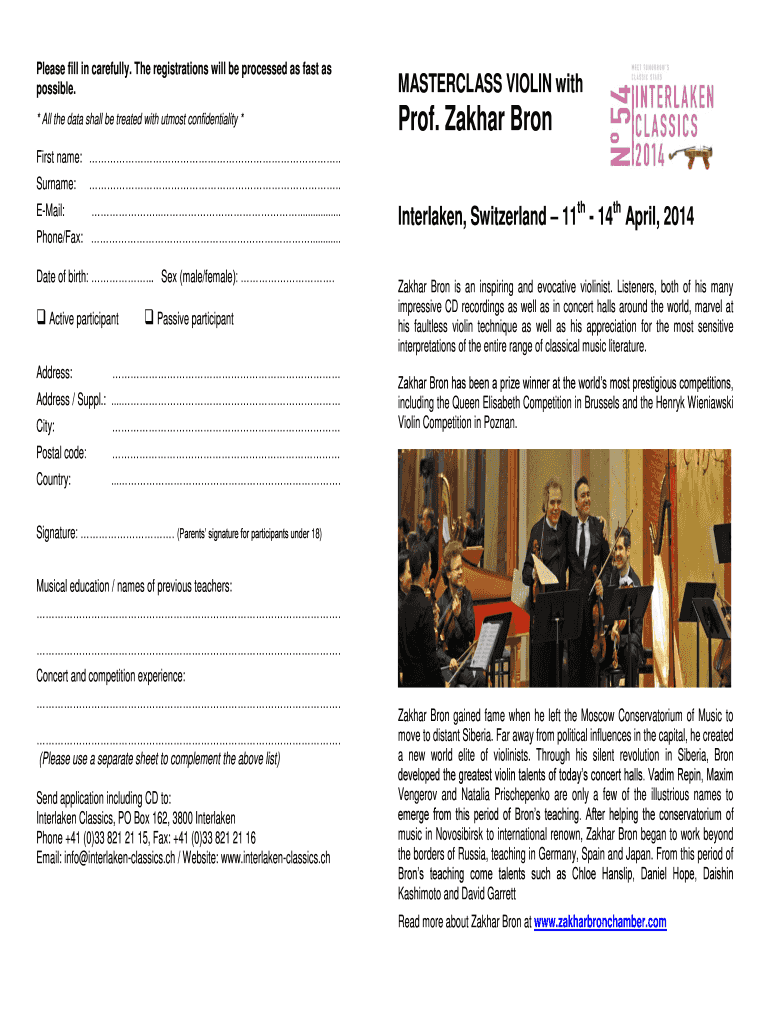 Please fill in carefully. The registrations will be processed as fast as possible. MASTERCLASS VIOLIN with * All the data shall be treated with utmost confidentiality * Prof. Akbar Born First name:.