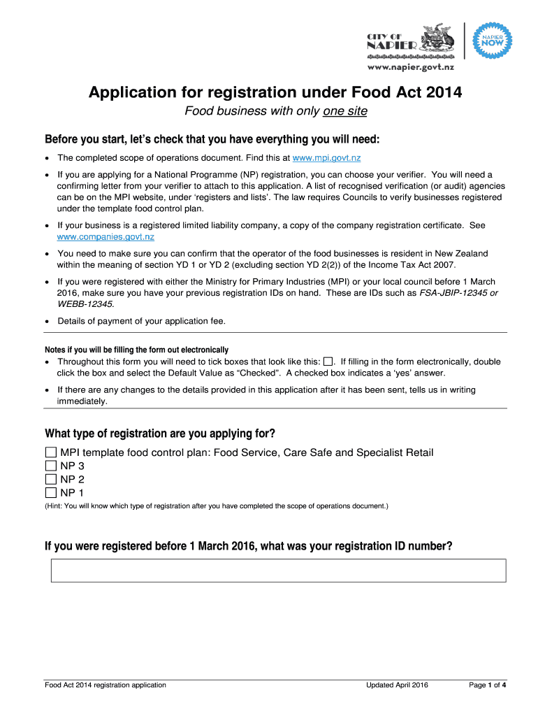 Page 1 of 4. Application for registration under Food Act 2014. Food business with only one site. Before you start, let#39’s check that you have everything you ... The completed scope of operations