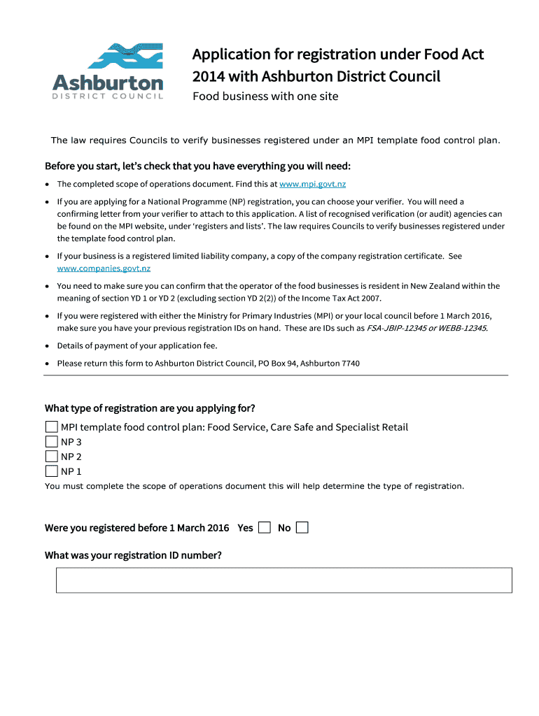 Application for registration under Food Act 2014 with Ashburn District Council Food business with one site The law requires Councils to verify businesses registered under an MPI template food control