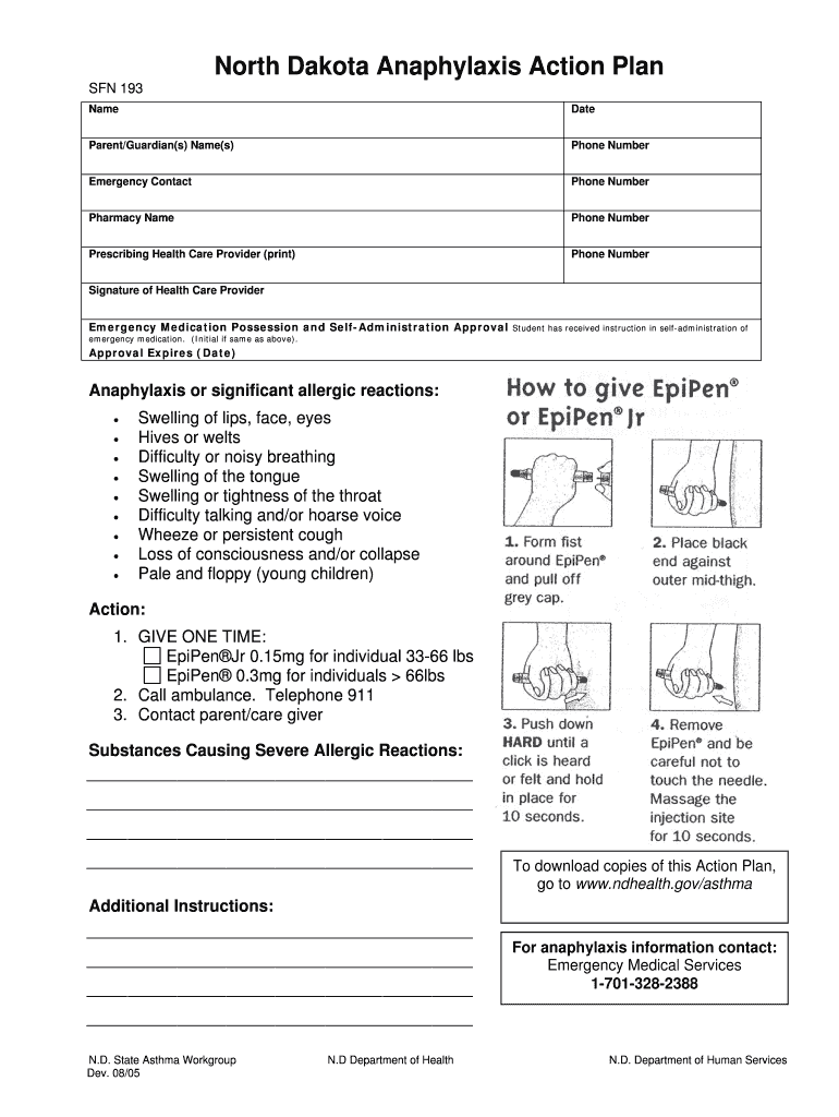 North Dakota Anaphylaxis Action Plan SON 193 Name Date Parent/Guardian(s) Name(s) Phone Number Emergency Contact Phone Number Pharmacy Name Phone Number Prescribing Health Care Provider (print) Phone