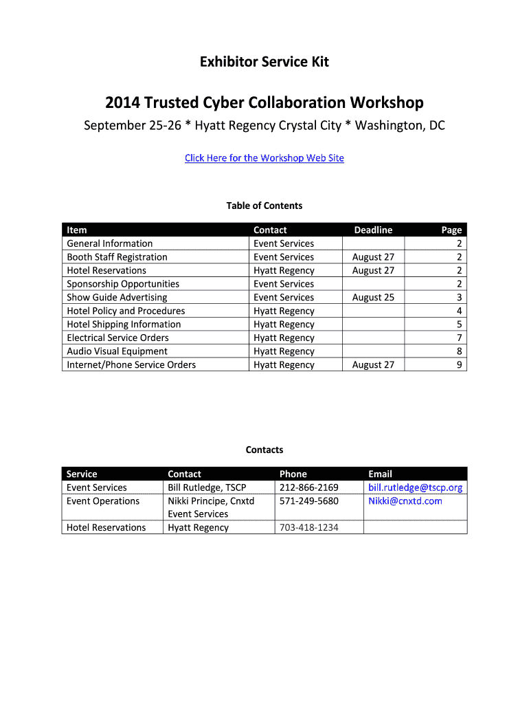Exhibitor Service Kit 2014 Trusted Cyber Collaboration Workshop September 2526 * Hyatt Regency Crystal City * Washington, DC Click Here for the Workshop Website Table of Contents Item General Information