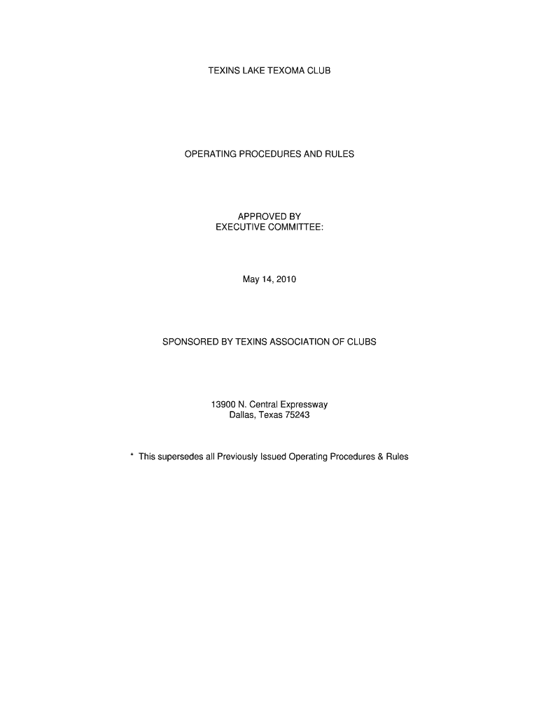 TOXINS LAKE TACOMA CLUB OPERATING PROCEDURES AND RULES APPROVED BY EXECUTIVE COMMITTEE: May 14, 2010, SPONSORED BY TOXINS ASSOCIATION OF CLUBS 13900 N. Central Expressway Dallas, Texas 75243 * This