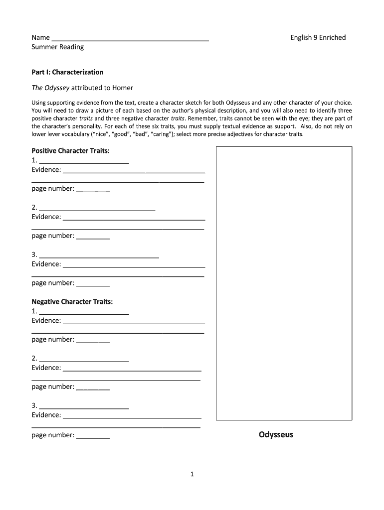 Name Summer Reading English 9 Enriched Part I: Characterization The Odyssey attributed to Homer Using supporting evidence from the text, create a character sketch for both Odysseus and any other character