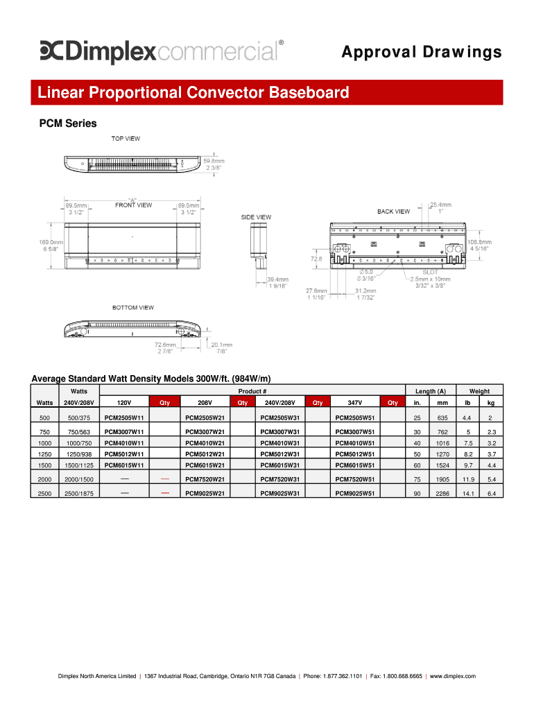 Approval Drawings Linear Proportional Convector Baseboard PCM Series Features Color Finish Voltage Construction Heating Element Watt Density Control Wall mount Control Accessories Installation Warranty
