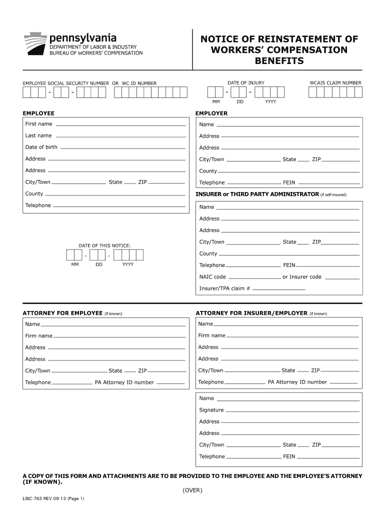 Department of labor & industry bureau of Workers CompensationNOTICE OF REINSTATEMENT WORKERS COMPENSATIONBENEFITSDATE OF INJURYEMPLOYEE SOCIAL SECURITY NUMBER OR WC ID NUMBERMMEMPLOYEEWCAIS CLAIM
