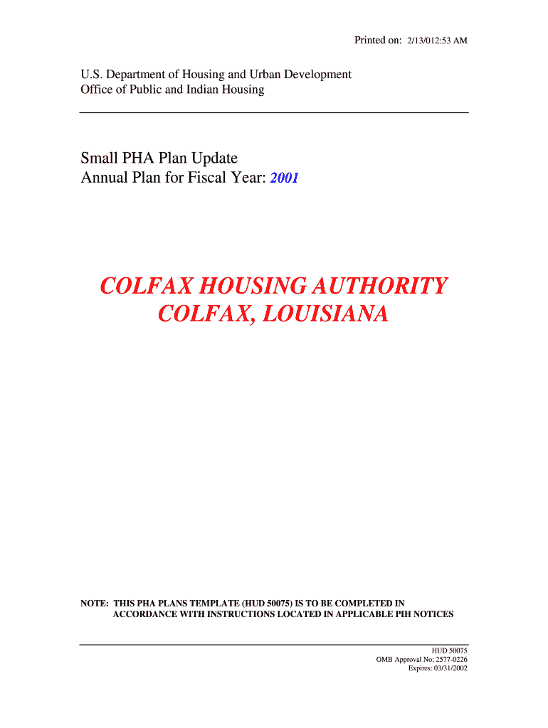Printed on: 2/13/012:53 AM U.S. Department of Housing and Urban Development Office of Public and Indian Housing Small PHA Plan Update Annual Plan for Fiscal Year: 2001 COLFAX HOUSING AUTHORITY COLFAX,