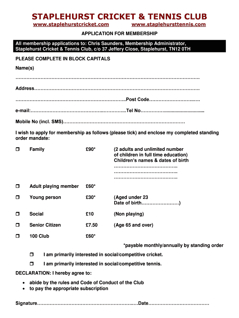 STAPLERS CRICKET & TENNIS CLUB www.staplehurstcricket.com www.staplehursttennis.com APPLICATION FOR MEMBERSHIP All membership applications to: Chris Saunders, Membership Administrator, Staplers Cricket