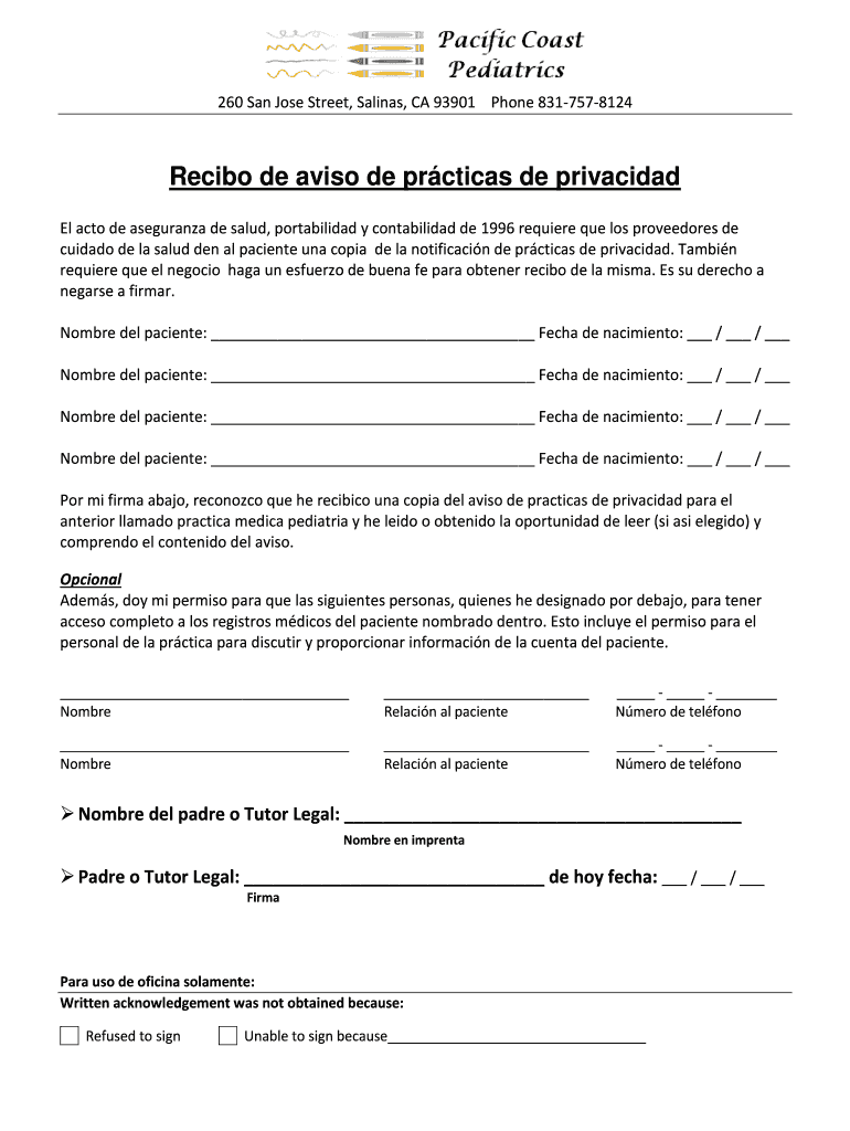 260 San Jose Street, Salinas, CA 93901 Phone 8317578124 Arecibo de Avis de practices DE privatized El act ode aseguranza de salad, portability y contabilidad de 1996 require Que Los procedures DE