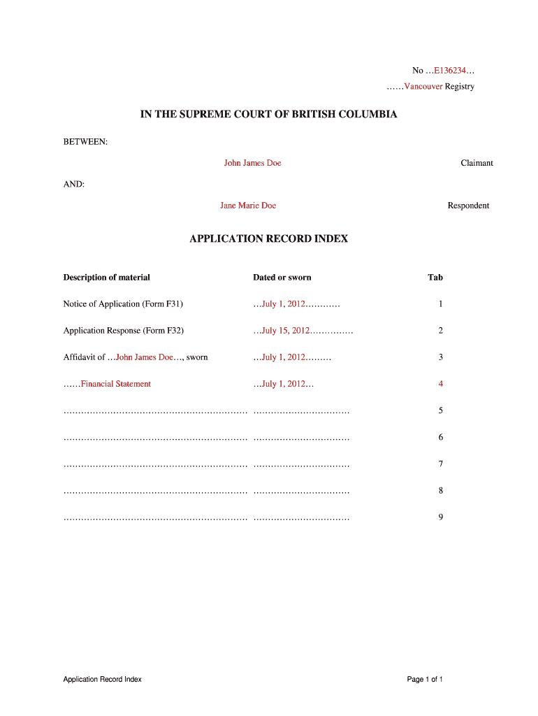 This document serves as an index for the application record in a case heard in the Supreme Court of British Columbia involving John James Doe as the claimant and Jane Marie Doe as the respondent.