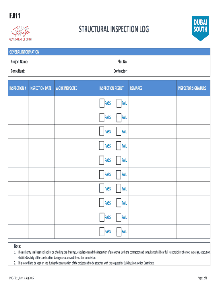 F.011 STRUCTURAL INSPECTION LOG GENERAL INFORMATION Project Name: Plot No. Consultant: INSPECTION # Contractor: INSPECTION DATE WORK INSPECTED INSPECTION RESULT PASS FAIL PASS INSPECTOR SIGNATURE