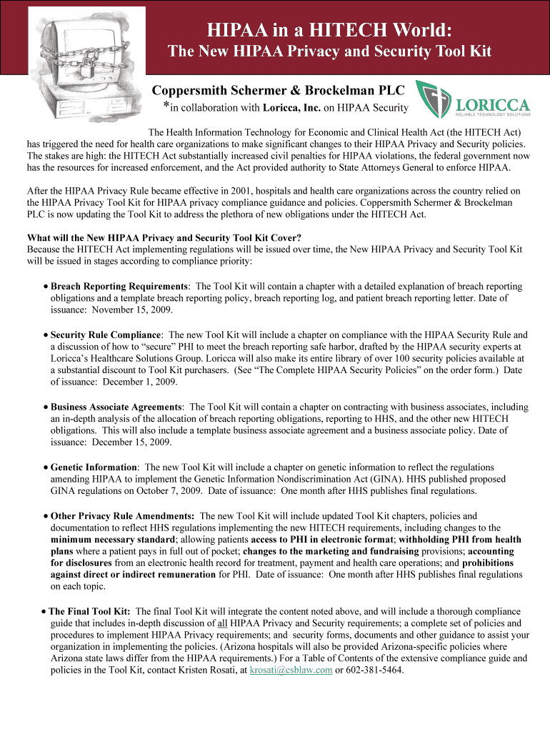 HIPAA in a HITCH World: The New HIPAA Privacy and Security Tool Kit Coppersmith Schemer & Brockman PLC *in collaboration with LOLICA, Inc. on HIPAA Security The Health Information Technology for Economic