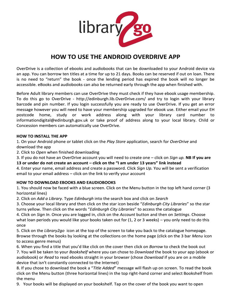 Get the free How to use the OverDrive app for Android - bEdinburghb - yourlibrary edinburgh gov